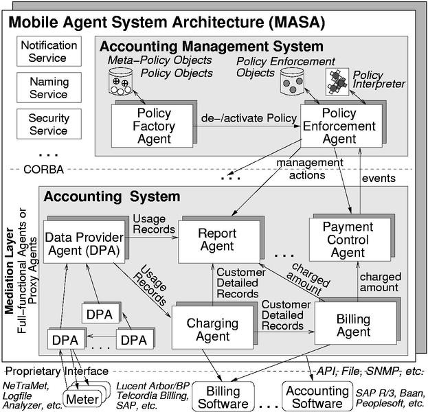 Implementation Details A reliable and secure accounting management system is the prerequisite for successful operation of an accounting system. Therefore, we decided to use the Mobile Agent System Architecture (MASA) [5] as our development and runtime environment. Basically, MASA can be separated into Agents providing a specific functionality and into the Agent System which provides the runtime environment for the Agents. MASA is completely written using Java/CORBA [3] and offers, as an MASIF [18] compliant agent system, several basic services like naming, notification and security. Additionally, to increase reliability of agents, a load balancing on basis of agent migration is possible. Following the design decisions described above, the accounting management system consists of two agents (see also Fig. 7): the Policy Factory Agent (PFA) and the Policy Enforcement Agent (PEA). The PFA offers an interface for creating, deleting, activating and deactivating accounting management policies as well as meta-policies. Furthermore, the PFA stores and retrieves policy objects and meta-policy objects which are specified in the policy description language (PDL) using XML. XML is used for this purpose, as by using a standard XML parser we do not need to implement a policy parser from scratch. In contrast to the PFA, the PEA controls and manages so-called policy enforcement objects (PEO) which are created just when a policy object is activated. A PEO is a CORBA object and reacts on received events by enforcing the specified management actions. In this case a PEO is executing CORBA calls using the CORBA Dynamic Invocation Interface (DII). Before executing management actions resp. invoking CORBA operations a PEO has to parse the policy. For this purpose a PEO uses a Policy Interpreter which is an adapted XML parser that evaluates the specified constraints. Basically, the Policy Interpreter returns ``true'' or ``false''. In case of ``true'' the PEO is firing the specified management activities. The mediation layer is implemented using various MASA (proxy) agents which represent the accounting system. These agents are either full-functional agents or-as in most cases-proxy agents for software products/components which offer the required functionality. Every agent implements an IDL interface which is corresponding to the sub-process' functionality. The IDL interface is developed by examining the sub-process interactions and activities from Section 4 in more detail. In case of a proxy agent a CORBA call at the agent's interface is transformed into appropriate instructions of the software component's interface. Thus, the underlying software components like billing systems can be exchanged without the need to neither reimplement the management system from scratch nor to respecify existing policies. All in all, from the manager's point of view an integrated, uniform view on accounting management is established.