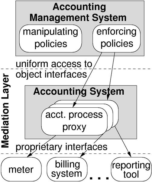 Management Architecture On the one hand we need to specify the elements of a policy description language (PDL) and on the other a management architecture that is capable of enforcing the specified policies. Hence, the specification of the policy-based management architecture determines the execution environment of policies. To fulfill the requirement of presenting one integrated view on accounting management, we introduce a mediation layer between the management system and the actual managed objects (i.e., the systems and applications implementing the accounting sub-processes). In this way, the management activities are executed on representatives of the managed objects and thus a uniform access on object interfaces during execution of policies is possible. The resulting policy-based accounting management architecture is depicted in Fig. 6. In order to increase the flexibility of the management environment we are modularizing the management application as well as the managed accounting system according to functionality classes. Regarding the management application we separated the functionality into operations which manipulate policies (like, e.g., creating and deleting policies) and into operations which enforce policies (i.e., interpreting the policy and executing the specified management actions). Regarding the accounting system we are using the sub-processes identified in 4.2 as a separation guideline: the functionality of every single sub-process is implemented by a separate module. When accessing the modules' interfaces within the mediation layer and thus calling a provided operation, the call is transformed to an appropriate call on the interface of the actual managed object. This could result into an API/SNMP/etc.-call as well as into altering a configuration file.