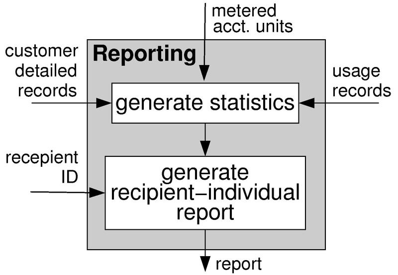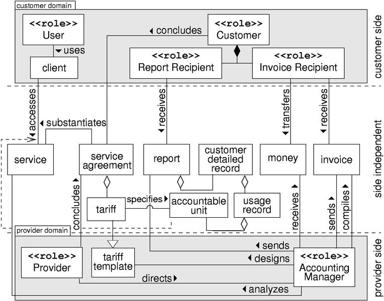 sent to report recipients on customer side, which in contrast to invoices contain detailed data about service usage and the applied tariffs but no request for payment. The provider directs the accounting manager by, e.g., specifying a set of policies enforced by the accounting manager. The latter is realizing the accounting process and thus usually this role is taken by several accounting components like meters, collectors, billing systems, reporting tools etc. and the management system which controls these components.