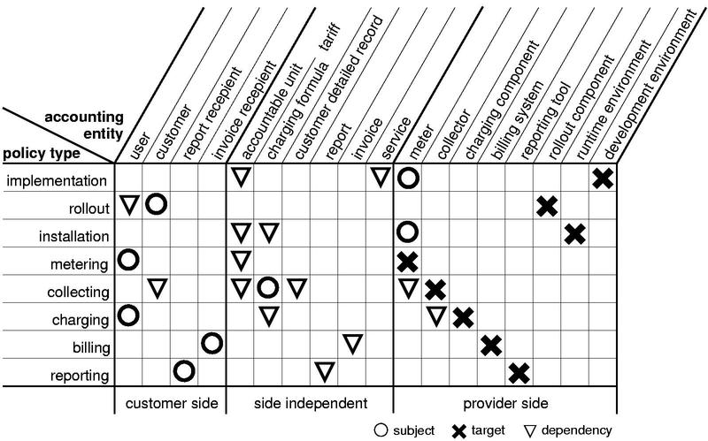 Table 1 summarizes the identified subjects and targets for the remaining sub-processes. Every table column represents one accounting entity identified in Fig. 5. The table rows represent policies managing specific sub-processes. For every single policy the created matrix contains exactly one circle representing the subject and exactly one cross representing the target. Additionally, several triangles were added representing that there is some kind of dependency between this specific policy and the marked accounting entity. These dependencies were identified during the analysis in Section 4.3 and are needed for specifying meta-policies, as we will show.