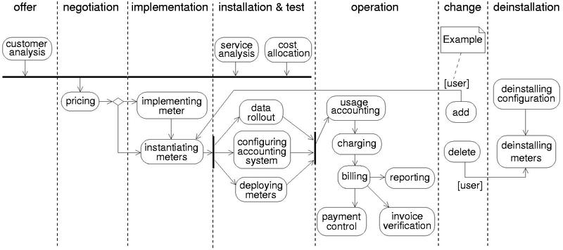 In the following, we describe 7 life cycle phases (see Fig. 2) which represent an extension of the service life cycle proposed in [4]. In the Offer phase the provider submits a proposition consisting of a service description and a desired tariff for service usage. The customer is usually reviewing several propositions from various providers at the same time. The Negotiation phase deals with the process of concluding a contract between the provider and customer of a service. Usually, a contract contains details about service functionality, quality of service (QoS) and of course tariffs as well as penalties. Afterwards, the provider is implementing the agreed service functionality in the Implementation phase. In the Installation & Test phase all resources like, e.g., equipment, end systems, interfaces, applications, etc. that are needed to provide service functionality are installed and tested so that the service can start its operation. After the customer expresses the statement of acceptance regarding the service provisioning, the Operation phase of the service life cycle starts. Regarding accounting management, in case of usage-based tariffs the actual service usage has to be metered and an invoice has to be compiled and sent to the customer. The Change phase combines all interactions in regard to changing service functionality, service implementation and service management. Therefore, the change phase has to be seen in parallel to the Operation phase. The service life cycle ends with the Deinstallation phase within which the implementation's resources are released.