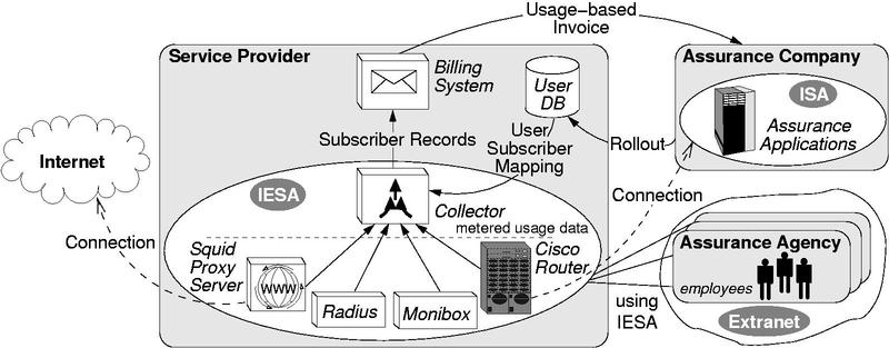To be able to assign metered usage data to specific employees and agencies the SP needs up-to-date information about all possible IESA users. Therefore, a user data rollout between the assurance company, which is aware of all possible users, and the provider has to be done frequently. To separate business from non-business IESA usage, usage data is collected from various sources: from a WWW proxy server, from several Dial-In Authentication Servers and from routers which establish the connection to the assurance company's ISA. WWW proxy usage data is always regarded as private usage whereas the remaining usage data is regarded as business usage. Afterwards, the usage data collector assigns the metered data to an accounting user ID and additionally decides whether usage data is cumulated to agencies or to single employees.